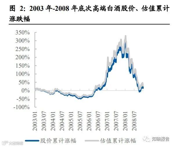 而此轮牛市终结于 2008 年初,是由于高估值叠加金融危机带来的戴维斯双杀 使得次高端白酒进入深度调整期。2008 年的国际金融危机爆发拖慢了宏观经济 发展速度,白酒政商需求大大降低,白酒行业景气度下滑,次高端白酒也因此 受到负面影响。