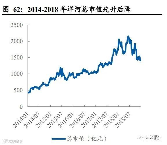 从 2014 年到 2018 年,洋河总市值从 500 亿元左右上升至 2000 亿元以上,市盈率从 2014 年 1 月的 7.52X 上升到 2018 年 1 月的 30X 左右。 本轮周期的下行驱动因素为“去杠杆”叠加贸易摩擦。而 2018 年中“去杠杆”叠加 贸易摩擦阻碍了了实体经济的发展,也抑制了白酒需求。2018 年中上市酒企面临业 绩增速放缓叠加估值下行的压力,白酒板块步入调整期,洋河公司股价也随之下滑。 2018 年开始洋河总市值开始下滑由 2102.25 亿元下降至 1427.42 亿元,市盈率也出 现下滑趋势,在 18 年 12 月下降至 17.66X 左右。
