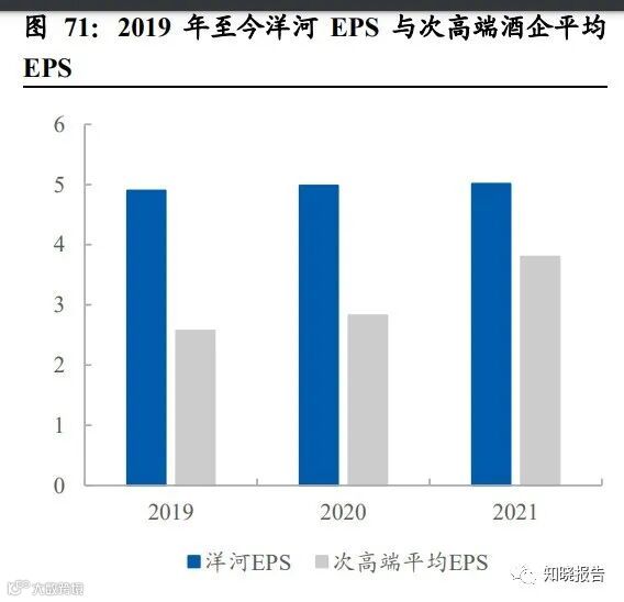 此周期中洋河 EPS 领先次高端平均,市盈率稳于次高端平均。2015 年洋河 EPS 出 现微小下滑,从 4.19 元/股降至 3.56 元/股,此后一直稳步上升至 2018 年的 5.39 元/ 股,而次高端酒企平均 EPS 虽然上升但一直未超过 2.5 元/股,洋河 EPS 远高于次高 端平均水平。此轮周期中,洋河市盈率一直稳在 40X 内水平,而次高端酒企平均市 盈率存在大幅波动,低至-150X,高达 191X。