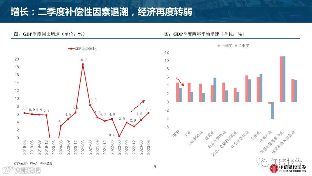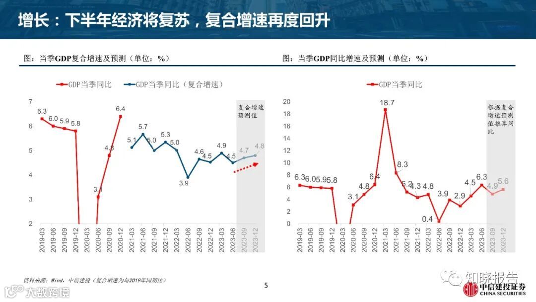 2023年二季度补偿性因素退潮,经济再度转弱;预计下半年经济复苏,复合增速再度回升,全年GDP5.4%。