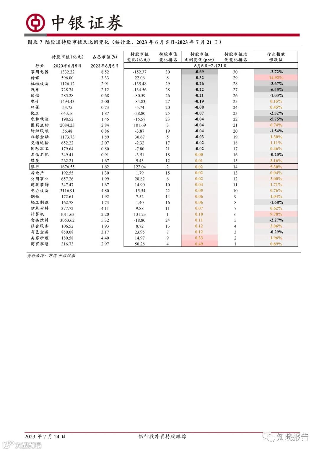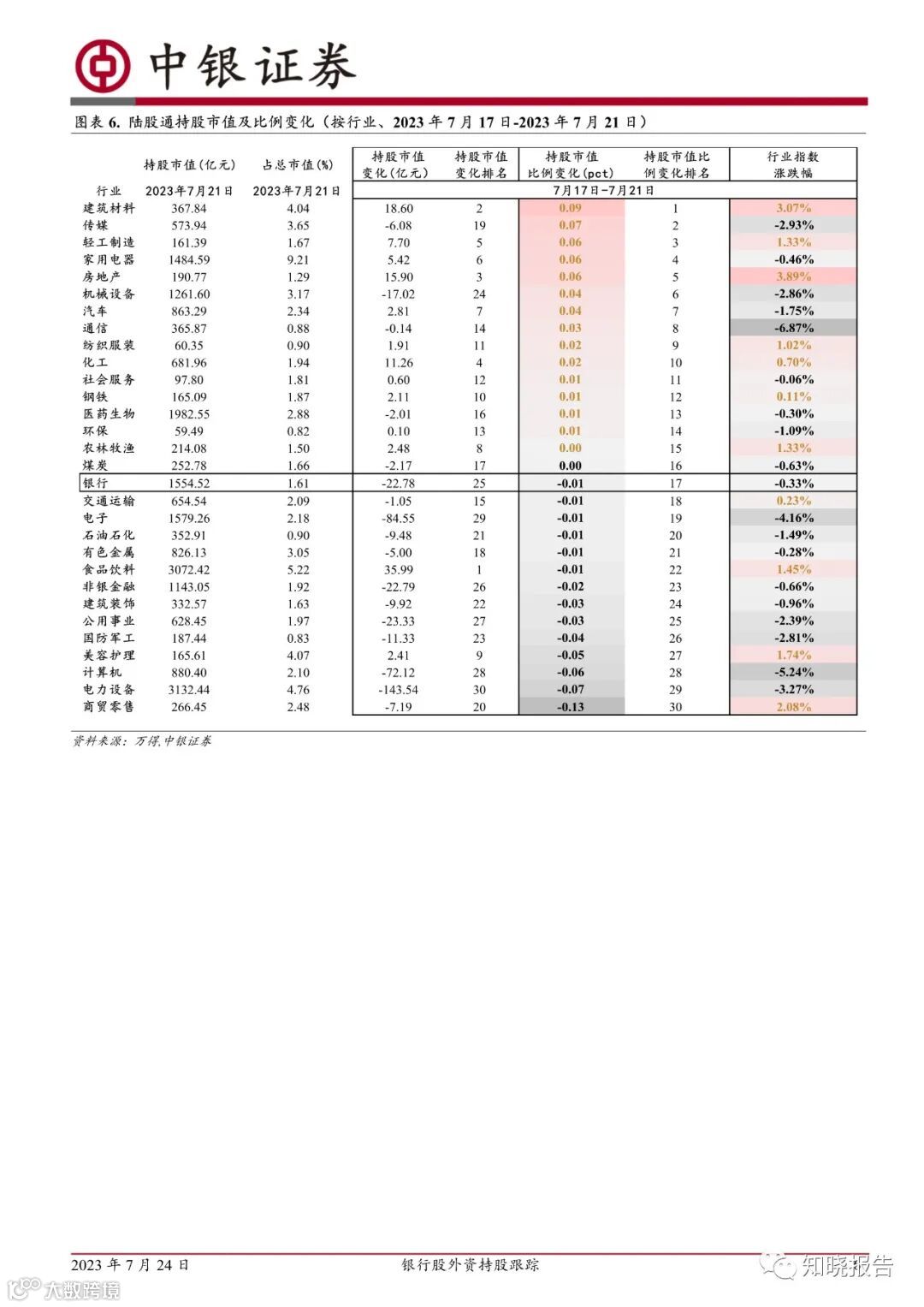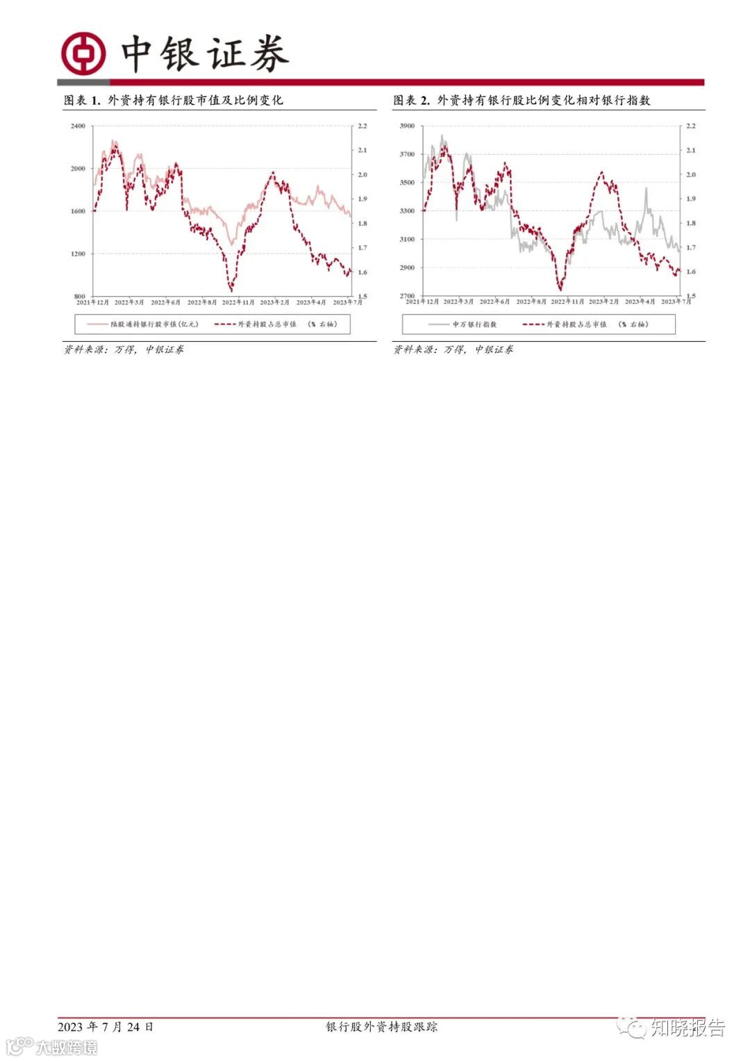 今年2月以来,外资持续减持银行股,5月开始减持幅度趋缓,截至7月21日外资持股银行比例接近去年11月低位。近期趋势来看,7月上旬持股趋势