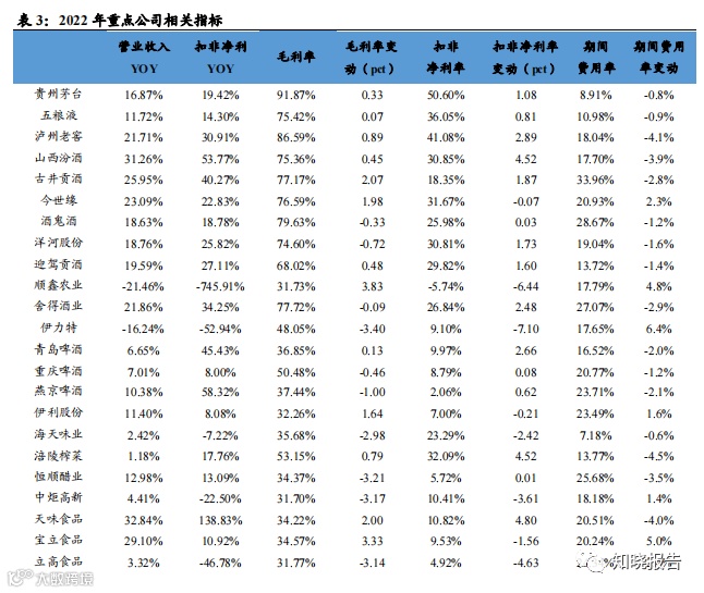 2022 年板块延续双位数增长,一线业绩韧性更强,二三线 Q4 承压且分 化。2022 年白酒收入+15%、利润+20%,其中 Q4 单季度收入同比+12%、 利润+18%,环比略有降速。分价格带看,一线白酒(茅五泸洋汾,下同) 2022 年收入+17%、利润+21%,增速快于行业、业绩韧性更强,收入、 净利润分别占白酒板块 79%、89%, Q4 单季度收入+16%、利润+20%, 其中茅台、老窖延续增长趋势,茅台 Q4 收入+17%、利润+21%,老窖 Q4 收入+16%、利润+28%,五粮液增长相对平稳,Q4 收入+10%、利润 +11%。汾酒表现最为亮眼,Q4 收入+20%、利润+127%,洋河 Q4 收入 +6%、利润+4%略有拖累。二线白酒 2022 年收入+7%、利润+12%,其 中 Q4 收入-1%、利润-11%,环比降速明显,其中古井收入和利润延续 双位数增长,Q4 收入+25%、利润+58%,老白干酒、舍得酒业利润端保 持双位数增长,舍得 Q4 收入+6%、利润+76%超市场预期。