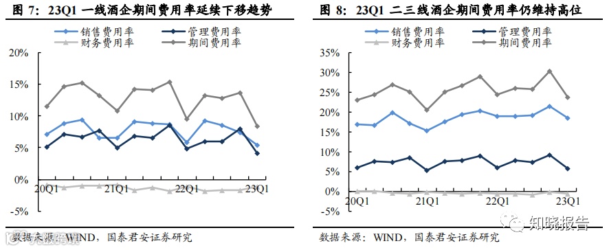 22 年一线酒企 费用率同比下降 1.4pct,其中销售、管理费用率分别同比下降 0.6pct、 0.5pct,二三线酒企受外部需求扰动,品牌优势相对弱于头部,22 年期 间费用率上行 1.4pct,其中销售费用占比提升 1.6pct;23Q1 板块迈入复 苏阶段,场景驱动下消费回补,一线酒企及二三线酒企期间费用率均向 好,其中一线酒企期间费用率下降 1.2pct,销售、管理费用项均有贡献, 二三线酒企期间费用率下降 0.7pct,主要来自于销售费率下移,但整体 看,二三线酒企期间费用率仍维持疫情以来相对高位。