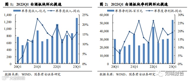 2023Q1 分化显著,高端稳健、次高端承压、区域酒高增。2023Q1 白酒 板块收入 1306 亿、净利润 535 亿,分别同比增长 16%、19%,增速同比 下降 3.7pct、下降 7.2pct,短期疫情冲击下逐步筑底。其中,一线白酒收 入 1052 亿,净利润 476 亿,分别同比增长 17%、20%,增速同比下降 3.2pct、下降 5.7pct,但降幅低于行业整体水平,业绩韧性较强,其中 Q1 茅台在基数不低情况下仍实现超预期增长,收入+20%、利润+21%, 五粮液平稳运行符合预期,老窖收入符合预期、利润+29%超预期,汾酒 收入+20%、利润+30%超预期,洋河环比加速。二三线白酒收入 253 亿, 净利润 59 亿,分别同比增长 10%、11%,增速环比改善显著,其中次高 端整体承压,舍得收入、利润均增长 7%,酒鬼收入、利润高双位数下 滑。区域酒相对稳健,收入增长中枢基本保持 20%,利润基本保持双位 数增长。
