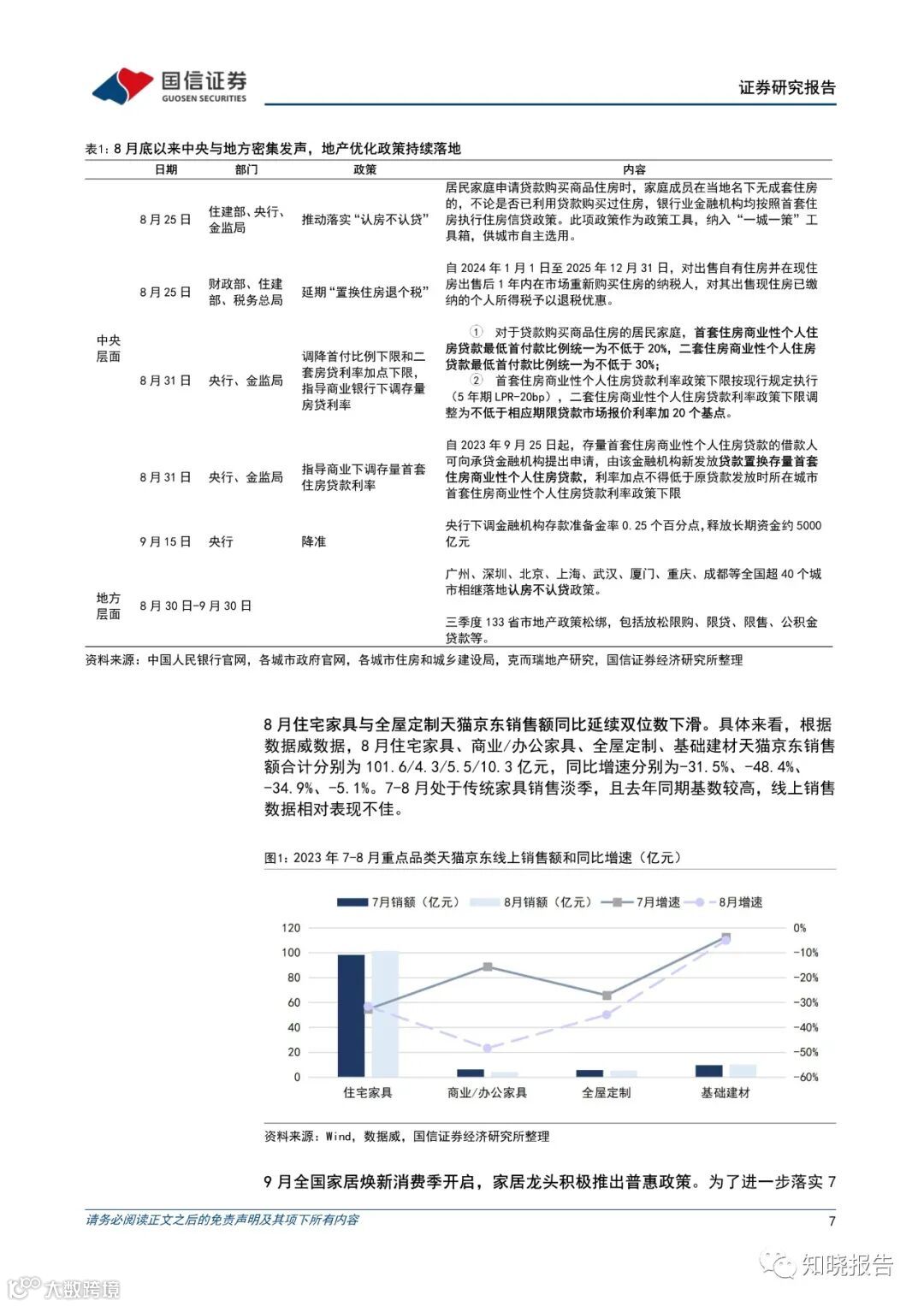 地产利好政策持续出台,家居迎金九银十消费旺季。8 月底以来地方地产优化政策相继落地,有望助推楼市销售回暖、提振家装家居需求。7-8月处于家具传统销售淡季,且去年同期基数较高,线上销售数据表现不佳。