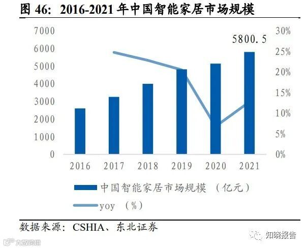随着技术迭代,智能家居场景拓宽、价值提升,智能家居市场空间广阔。据 CSHIA 统计,2016-2021 年我国的智能家居市场规模从 2608 亿元增长至 5800 亿元,CAGR 为 17.33%。据 IDC 统计,2017-2021 年我国智能家居设备出货量从 1.1 亿台 增加至 2.3 亿台,CAGR 为 20.25%。从发展阶段看,中国智能家居行业逐步从围 绕单品控制为核心的智能单品阶段,发展至以场景多元化及空间智能化为目标的 互联互通初级阶段。未来,中国智能家居行业有望凭借人工智能、物联网及云计 算等技术发展和应用领域拓宽,进一步迈向互联互通的成熟阶段,甚至进入主动 洞察客户需求及自发提供相应服务的全面智能阶段。预计随着物联网、人工智能 等技术的逐渐成熟,中国智能家居市场将迎来机遇期,快速发展。