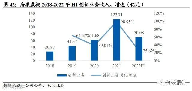 增速最快的创新业务之一,2019-2021 年收入 CAGR 84.20%。2019 年海康机器人 首次盈利,营收达 8.14 亿,2021 年营收达到 27.62 亿元,2019-2021 年收入 CAGR 84.20%,持续高增长,是当前增速最快的创新业务之一。