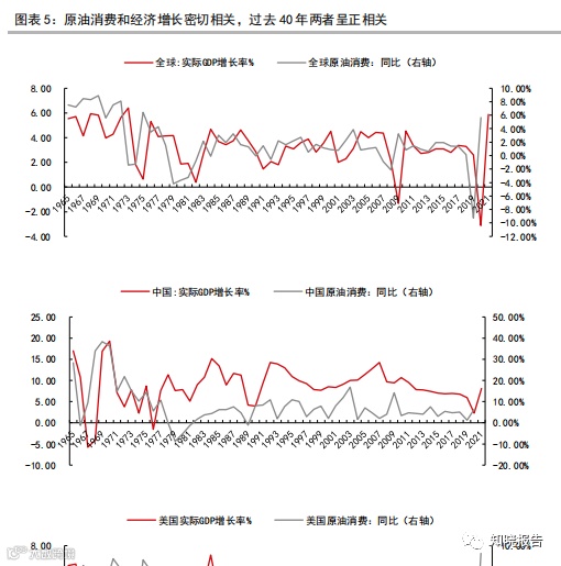 原油的需求和经济增长密切相关。需求上,原油消费和经济增长显著正相关, 回顾过去 40 年原油需求和经济走势,可以发现,两者走势高度一致。