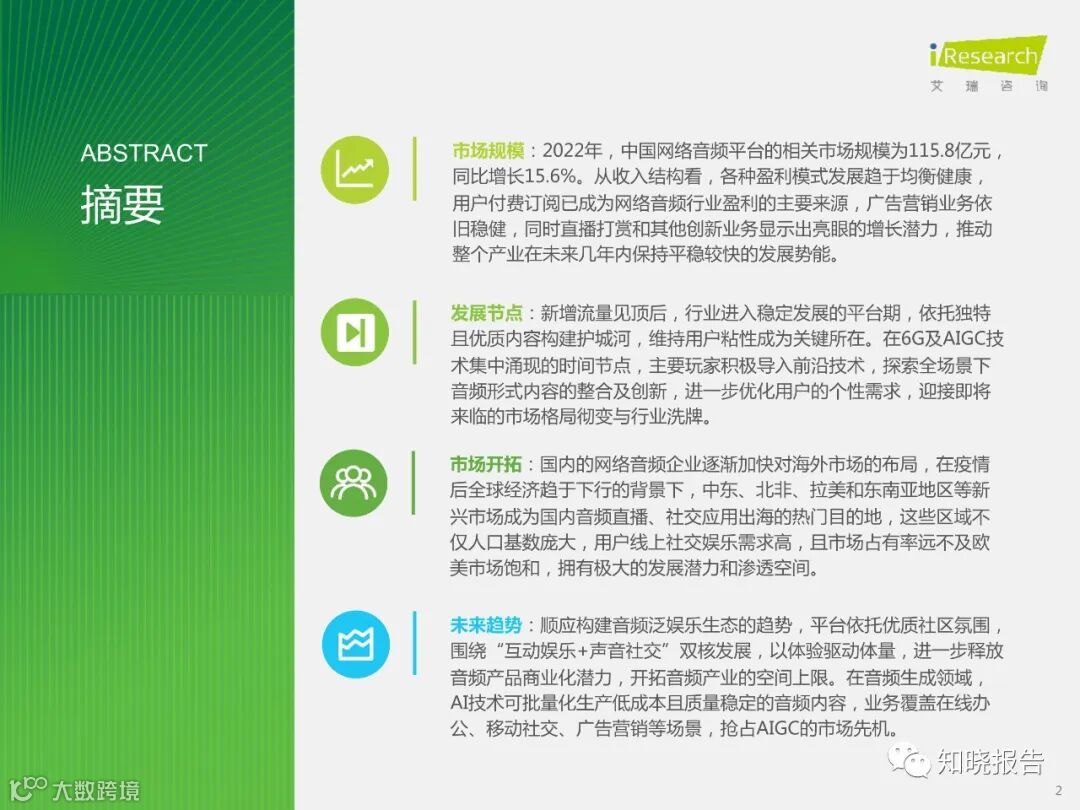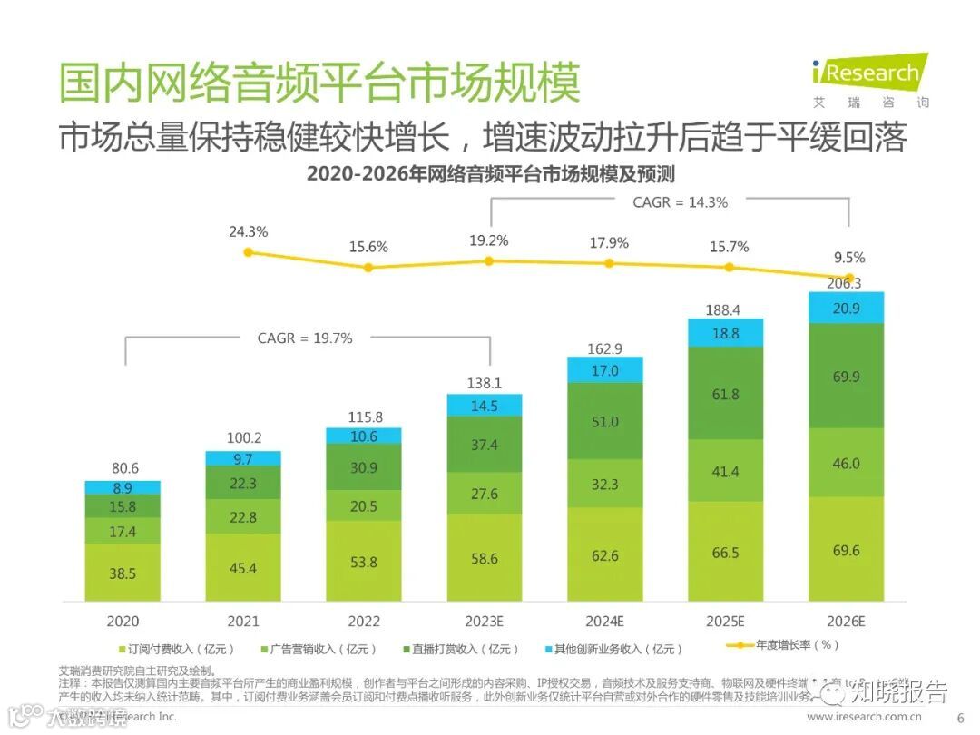 2022年,中国网络音频平台的相关市场规模为115.8亿元,同比增长15.6%。从收入结构看,各种盈利模式发展趋于均衡健康,用户付费订阅已成为网络音频行业盈利的主要来源,广告营销业务依旧稳健,同时直播打赏和其他创新业务显示出亮眼的增长潜力,推动整个产业在未来几年内保持平稳较快的发展势能。