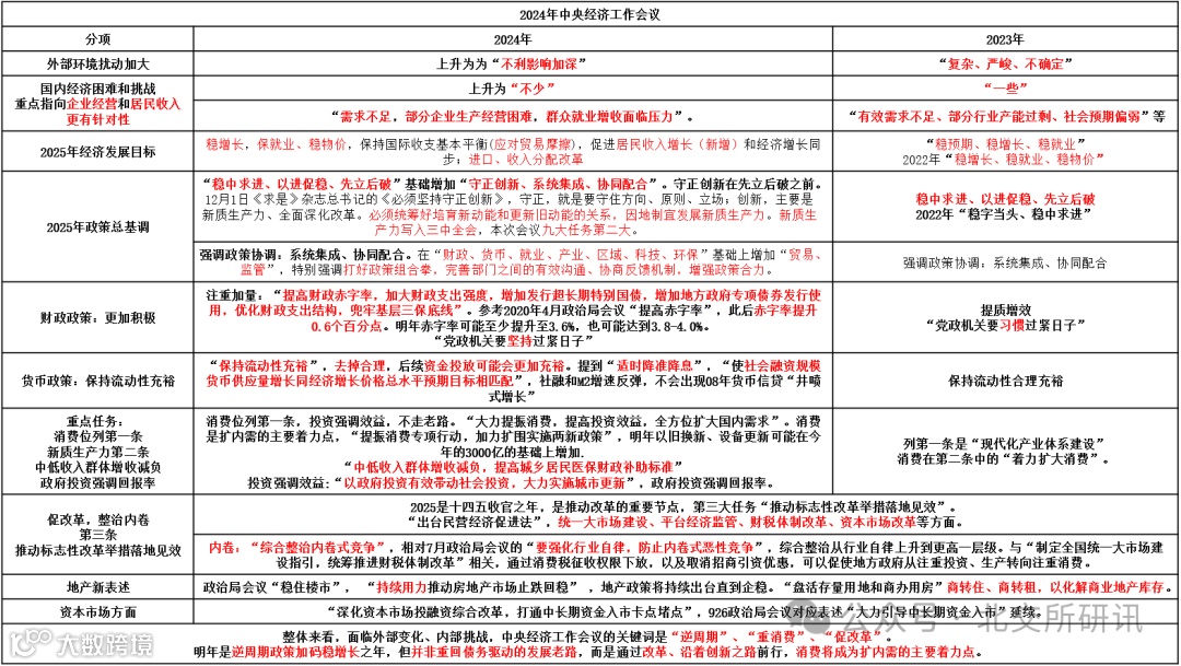 七、重点任务中消费位列第一条,同时投资强调效益,不走老路。“大力提振消费,提高投资效益,全方位扩大国内需求”。而去年列第一条是“现代化产业体系建设”,消费在第二条中的“着力扩大消费”。明年消费是扩内需的主要着力点,具体政策上,会议提到“提振消费专项行动,加力扩围实施两新政策”,明年以旧换新、设备更新可能在今年的3000亿的基础上增加值4000亿或以上。会议还提到“中低收入群体增收减负,提高城乡居民医保财政补助标准”,可能会适当给与财政支持。