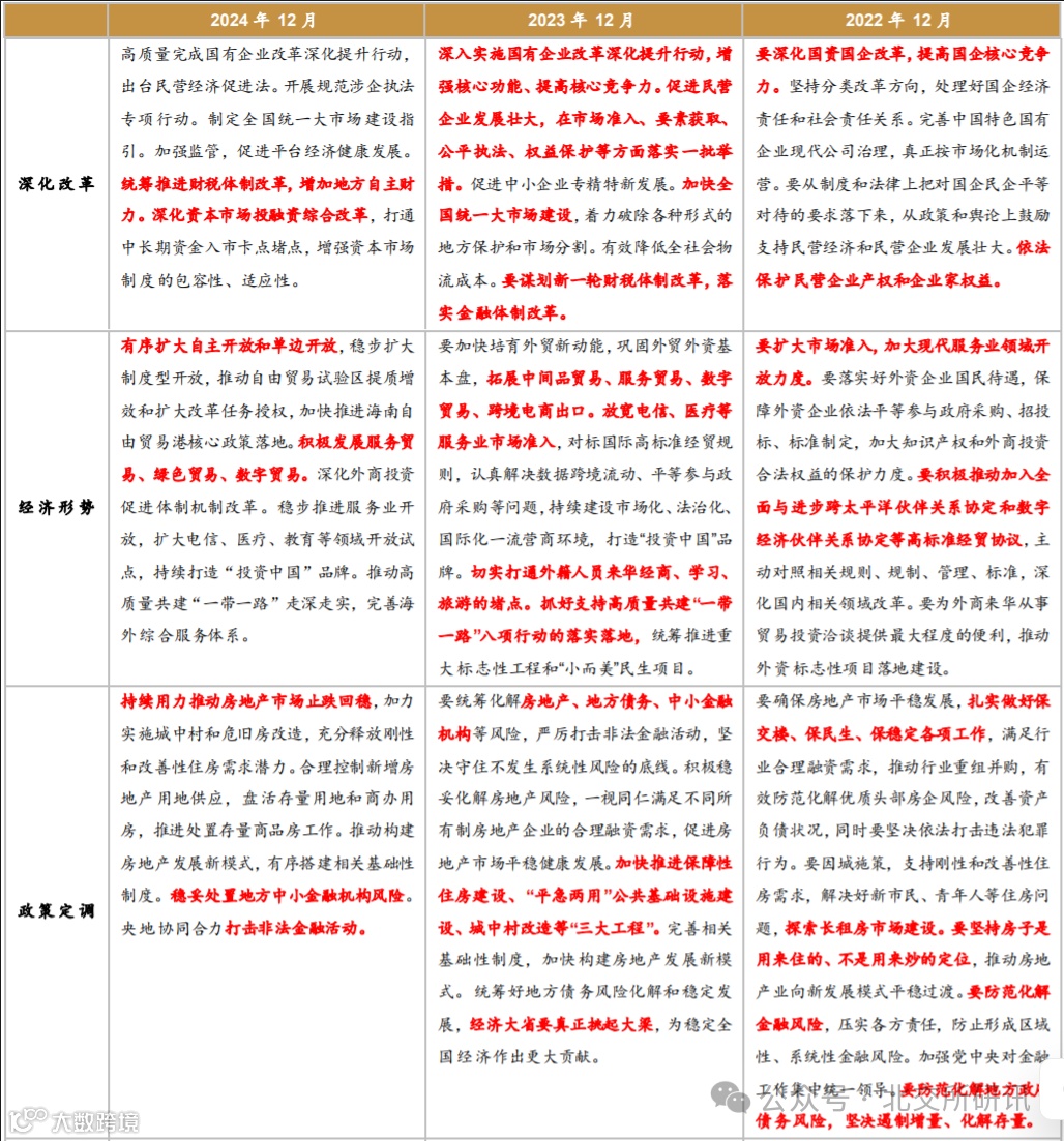 强调政策协调:系统集成、协同配合,强调政策协调。去年会议就提及,今年在“财政、货币、就业、产业、区域、科技、环保”的基础上加了“贸易、监管”,还特别强调打好政策组合拳,完善部门之间的有效沟通、协商反馈机制,增强政策合力。