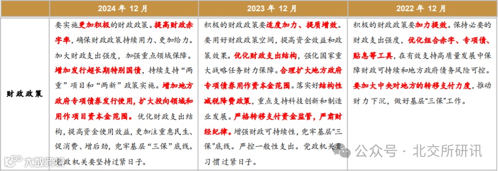 更加积极的财政政策同样对应着细节上的调整。和2023年底中央经济工作会议强调的三个“严”(严格转移支付资金监管、严肃财经纪律、严控一般性支出)相比,2024年的四个“加”(加大财政支出强度、加强重点领域保障、增加发行超长期特别国债、增加地方政府专项债券发行使用)呈现出显著的逆周期特征。