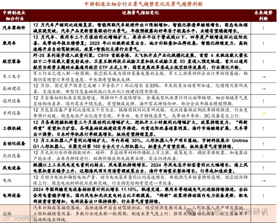中游制造业:电力设备海外市场需求整体增长,低空经济持续上行,人形机器人年产项目落地中游制造板块整体表现有所回升,内需方面,新一轮国家补贴稳步推进,汽车智能化持续发力,自动化设备、低空经济持续向好,工程机械销售多数改善,部分行业有望迎来供需格局改善。