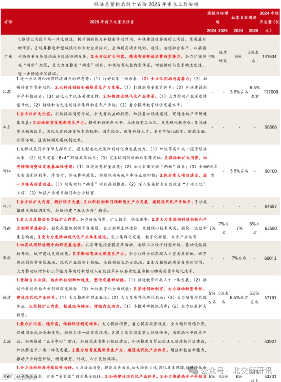 各省份2025年前三大重点工作主要围绕“科技创新”、“产业升级”和“扩大内需”开展,化债重点省份工作表述与经济大省并无太大区别,亦在扩内需、培新产方面发力,并强调因地制宜发展新质生产力,构建符合省情实际的现代化产业体系。如广西继续以工业为本、吉林强调加快高水平农业强省建设、宁夏和青海以生态文明建设为突破口。