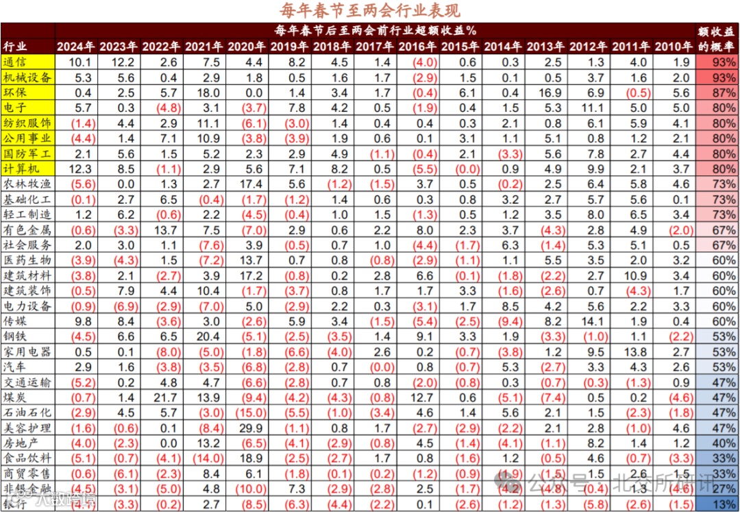 春季后随着流动性的边际改善,市场风险偏好有望逐渐提升,主题投资关注度预计提升。统计2010年以来春节后至两会前,取得超额收益概率较高的行业依次是通信、机械设备、环保、电子、纺织服饰、公用事业、国防军工、计算机。