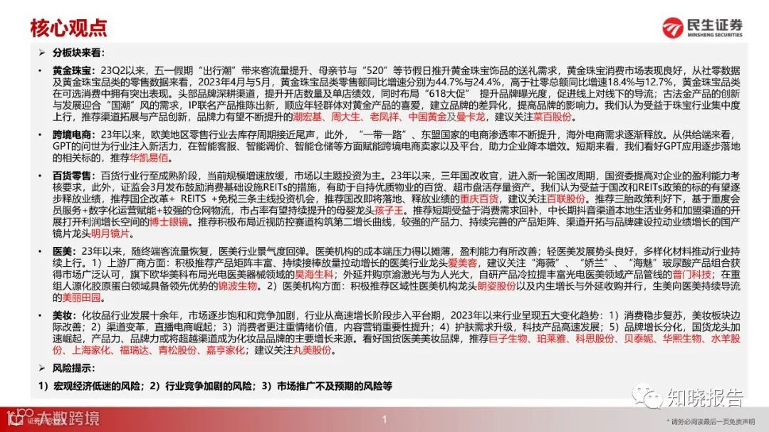 跨境电商:23年以来,欧美地区零售行业去库存周期接近尾声,此外,东盟国家的电商渗透率不断提升,海外电商需求逐渐释放。从供给端来看,GPT的问世为行业注入新活力,在智能客服、智能调价、智能仓储等方面赋能跨境电商卖家以及平台,助力企业降本增效。短期来看,我们看好GPT应用逐步落地的相关标的,推荐华凯易佰。