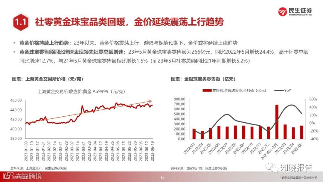 黄金珠宝:23Q2以来,五一假期“出行潮”带来客流量提升、母亲节与“520”等节假日推升黄金珠宝饰品的送礼需求,黄金珠宝消费市场表现良好,从社零数据及黄金珠宝品类的零售数据来看,2023年4月与5月,黄金珠宝品类零售额同比增速分别为44.7%与24.4%,高于社零总额同比增速18.4%与12.7%,黄金珠宝品类在可选消费中拥有突出表现。