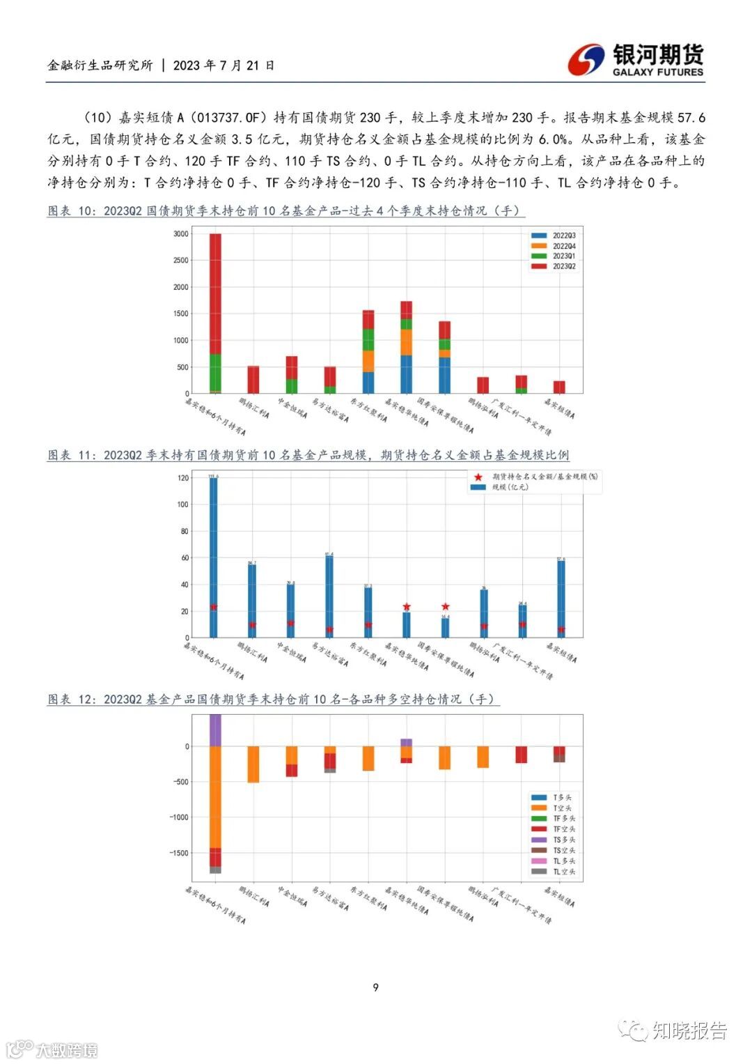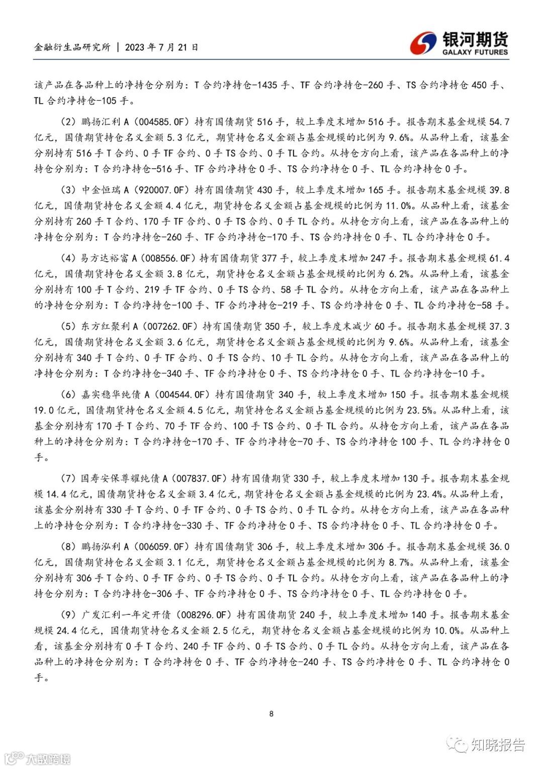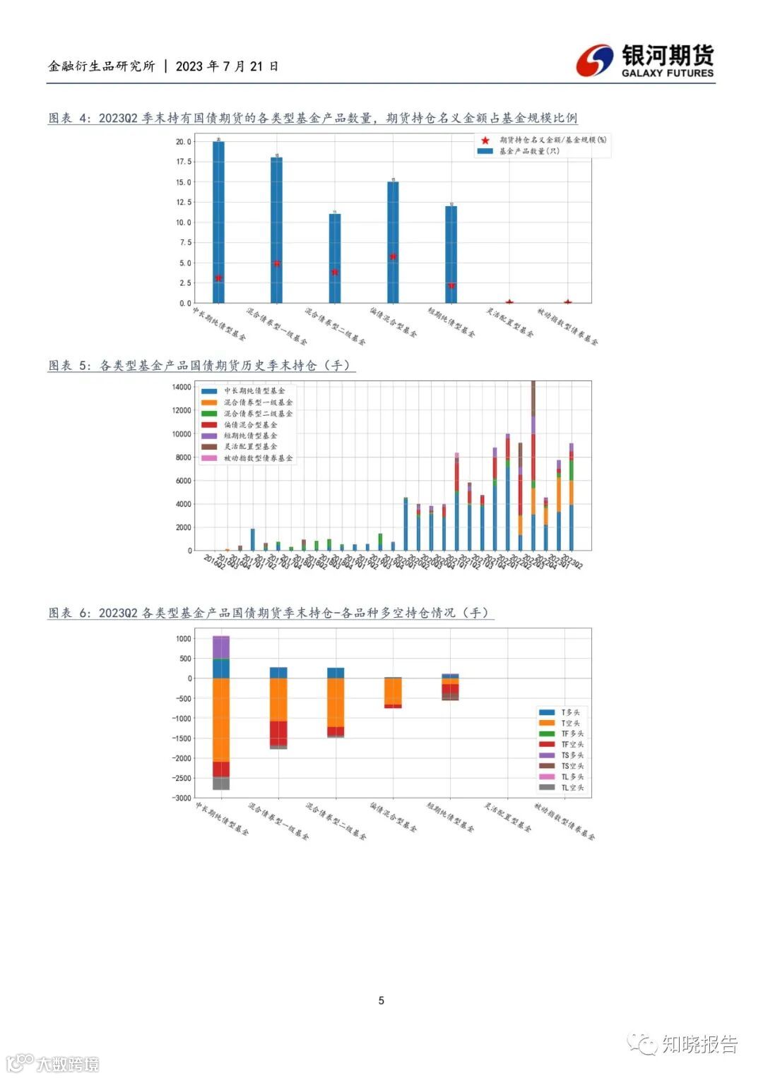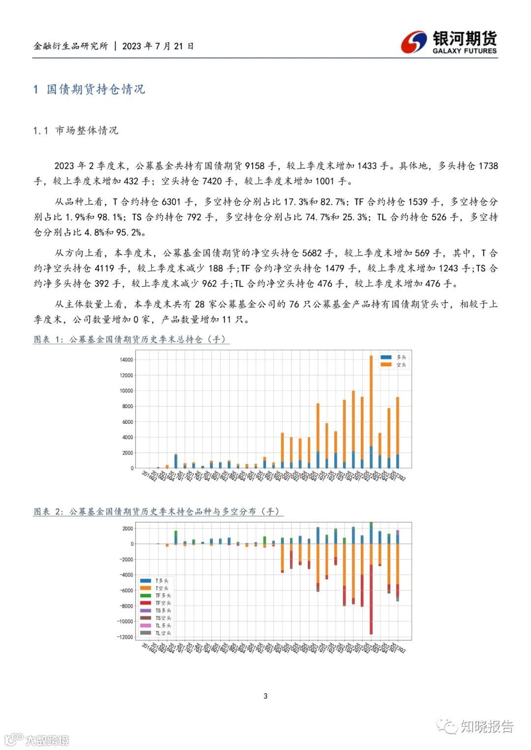 2023年2季度末,28家公募基金公司的76只公募基金产品共持有国债期货头寸9158手,较上季度末增加1433手。具体地,多头持仓1738手,较上季度末增加432手;空头持仓7420手,较上季度末增加1001手。从分布上看,T合约持仓6301手,多空持仓分别占比17.3%和82.7%;TF合约持仓1539手,多空持仓分别占比1.9%和98.1%;TS合约持仓792手,多空持仓分别占比74.7%和25.3%;TL合约持仓526手,多空持仓分别占比4.8%和95.2%。