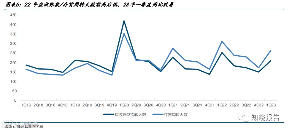 2022 年营运效率持续提升,全年应收账款和存货周转天数呈现前高后低。2022 年 Q4 通信 行业平均应收账款周转天数为 148 天,比 21 年同期增加 12 天,比 Q3 减少 23 天,收账效 率有所上升。Q4 存货周转天数为 171 天,比 21 年同期增加 7 天,环比 Q3 减少 58 天,营 运效率有所增强,与芯片供应链紧张程度缓解、疫情影响产品交付程度减弱有关。23 年 一季度周转天数分别同比下降 42/50 天,随着通信上游供应链紧张程度缓解,23 年营运 效率有望不断提高。