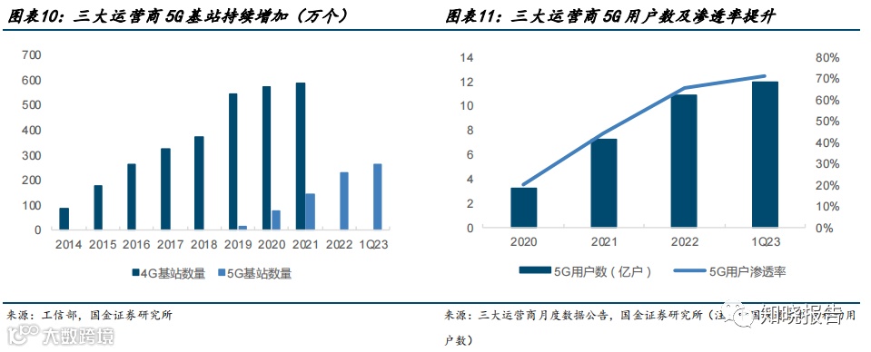 运营商:业务持续放量,基本面呈现趋势性好转。受益于新兴业务回暖放量,三大运营商 业务经营情况持续向好。2022 全年及 23 年一季度,三大运营商移动用户数、固网宽带接 入数均有增长,营收和净利润都出现较快增长。截至 1Q23,根据工信部数据统计 5G 基站 总数达 264.6 万个,一季度净增 33.4 万个;5G 用户数为 11.96 亿户,5G 渗透率在 70%左 右。同时 IPTV、互联网数据中心、大数据、云计算、人工智能等新兴业务,业务逐渐回 暖放量。