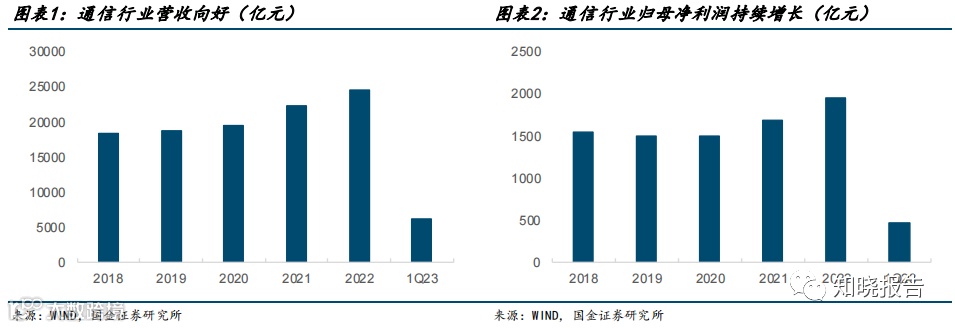 通信板块 2022 年营收向好,归母净利润持续增长,23 年一季度毛利率和净利率环比提升, 经营现金流量净额有小幅改善改善。营收稳定增长,2022 全年收入合计 24485 亿元,同 比增长 9.5%;归母净利润 1954 亿元,同比增长 15.9%,实现增利超过增收的正向剪刀差。