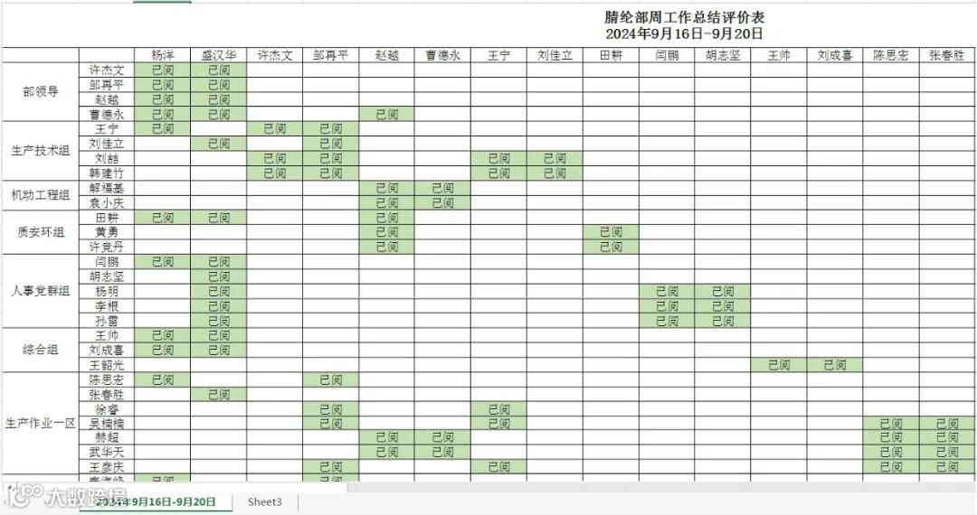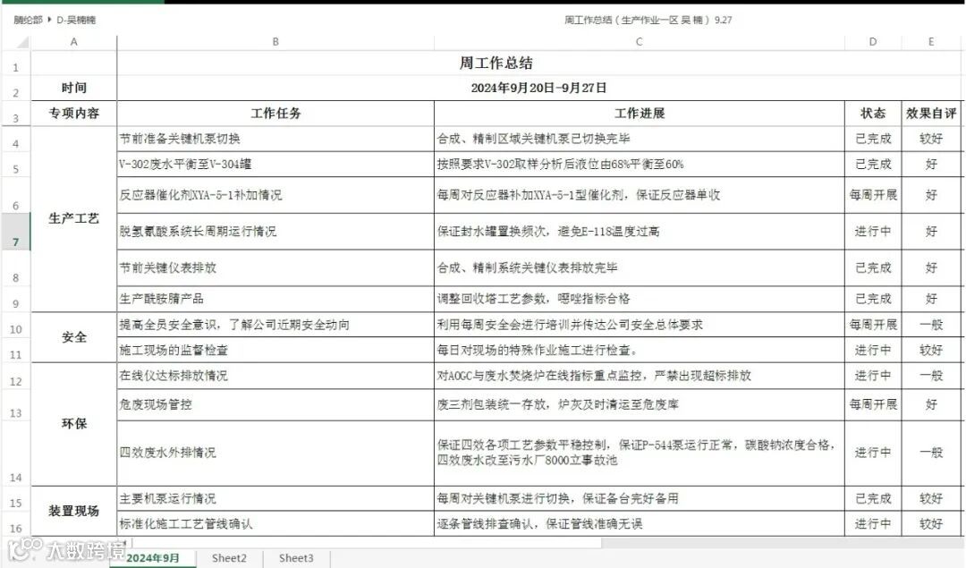 制定《腈纶部领导干部周考核办法》,对照岗位职责对厂领导及主管以上领导干部每周工作任务完成情况进行考核,利用综合调度会及部主页专栏,以周总结、评价、考核、公布的形式推进。考核措施实行工作任务清单制、工作任务包干制、工作落实通报制、工作激励约束制,要求厂领导和主管以上领导干部每周对工作任务进行清单化总结及效果自评,由主管厂领导、分管领导、业务组(作业区)负责人对每周梳理工作任务进行评价,确保工作任务明确、责任明晰、时限明确。