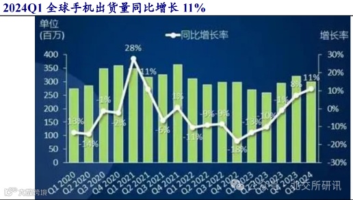 随着全球宏观经济复苏以及消费需求回暖,2024年第一季度全球智能手机出货量同比增长11%。智能手机出货量在经历了2021Q3以来的下行周期后,在2023Q4开始回暖明显。