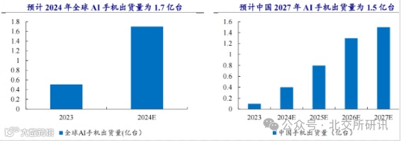 全球AI手机出货量有望保持高增。2024年全球AI手机出货量有望达到1.7亿台,占全球市场比例为15%。2027年,中国AI手机出货量有望达到1.5亿台,占中国手机比例有望从2023年5.5%提升至2027年的51.9%。