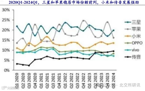 三星、苹果稳居市场前列,小米和传音发展动能强劲。从市场份额来看,2024Q1,三星在Galaxy AI的推动下,三星以20%的市场份额重新回归榜首,苹果位居第二。而得益于走量机型的推动,传音和小米增长强劲,低端市场的竞争愈演愈烈。