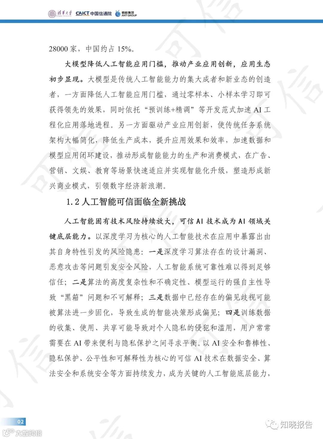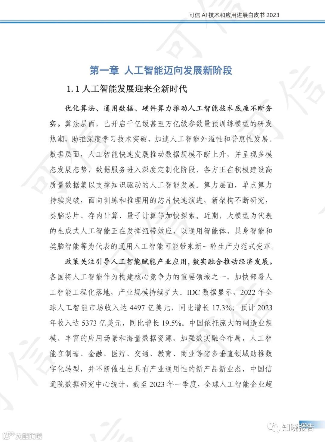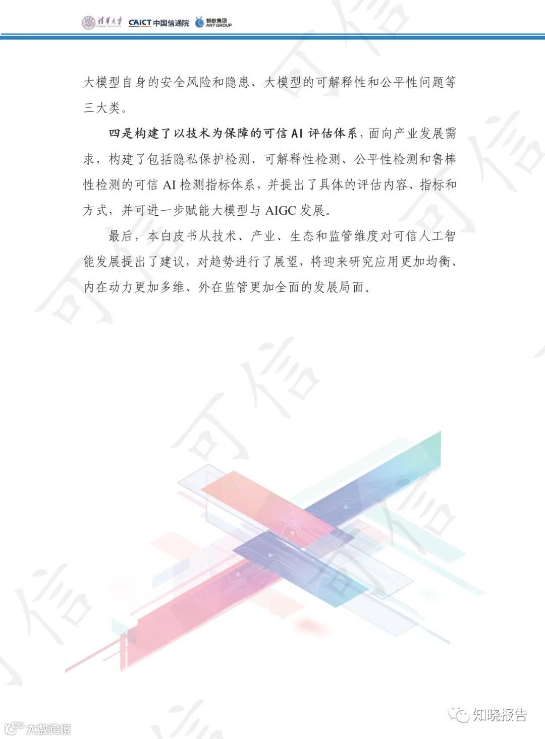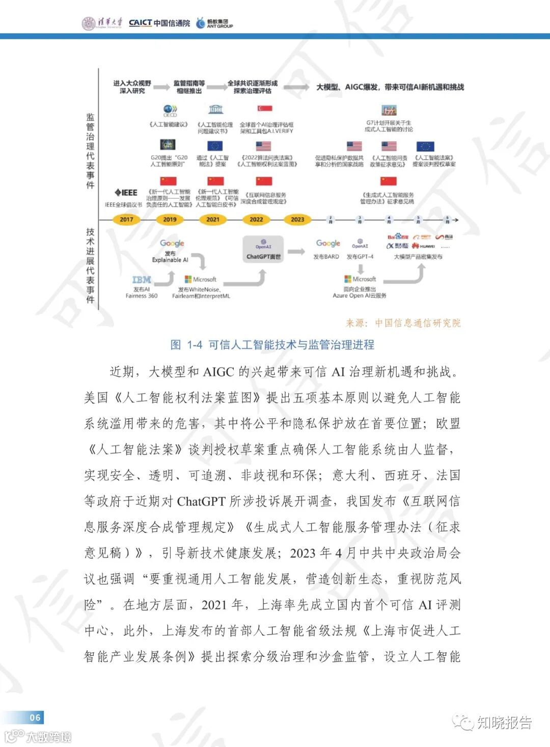 伴随人工智能技术底座不断夯实和大模型、AIGC 等的爆发式增长,人工智能迈出了走向通用人工智能的关键一步,2023 年 4 月中共中央政治局会议强调“重视通用人工智能发展,营造创新生态,重视防范风险”,可信 AI成为新阶段平衡创新与风险的重要技术手段。