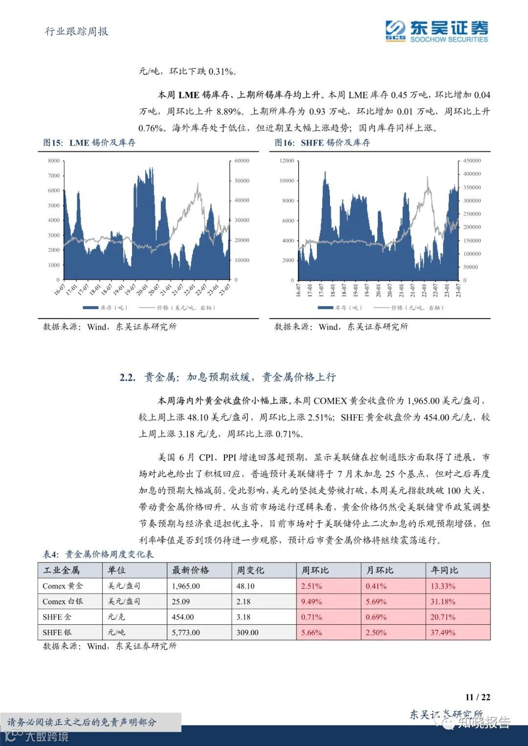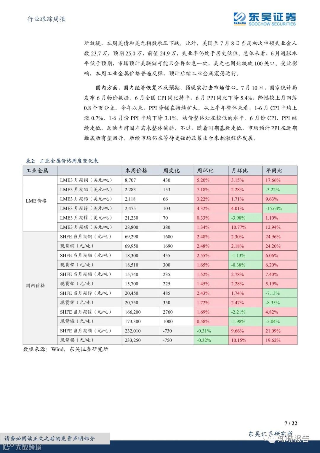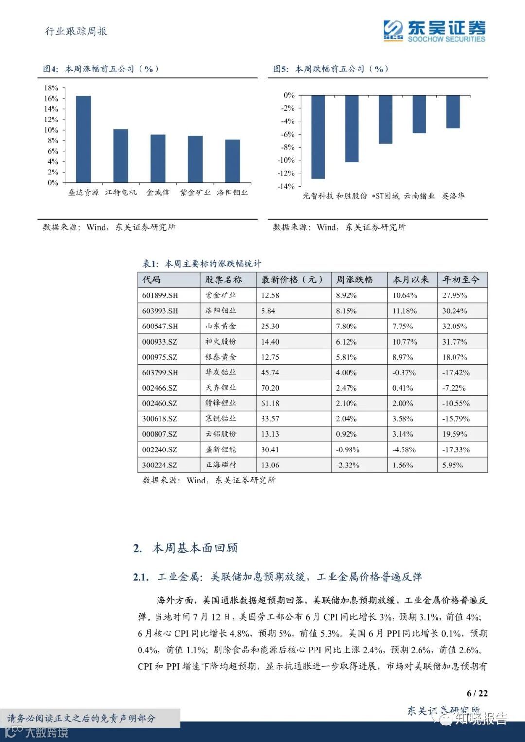回顾本周行情,有色板块本周上涨2.34%,在全部一级行业中涨幅居前。二级行业方面,贵金属、工业金属、能源金属、小金属板块上涨,金属新材料板块下跌。工业金属、贵金属方面,美国6月CPI和PPI增速下降均超预期,显示抗通胀进一步取得进展,市场对美联储加息预期有所放缓,本周美债和美元指数承压下跌,受此影响,工业金属、贵金属价格普遍上涨,预计后续工业金属、贵金属震荡运行。