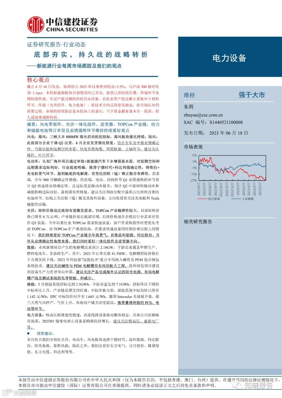截止6月16日收盘,每周组合2023年以来绝对收益+3.5%,与沪深300相对收益+1.1pct。本轮新能源板块目前底部应已夯实,估值已到较低位置,终端环节业绩持续性强,不过产能过剩的担忧仍未结束,目前来看产能过剩主要集中于材料环节,终端(光伏组件、电力电池)、新技术方向反而愈发确定;但市场认知仍需要过程,业绩的持续验证是本轮向上的基石,当下资金搬家基本告一段落,持久战迎来战略转折。