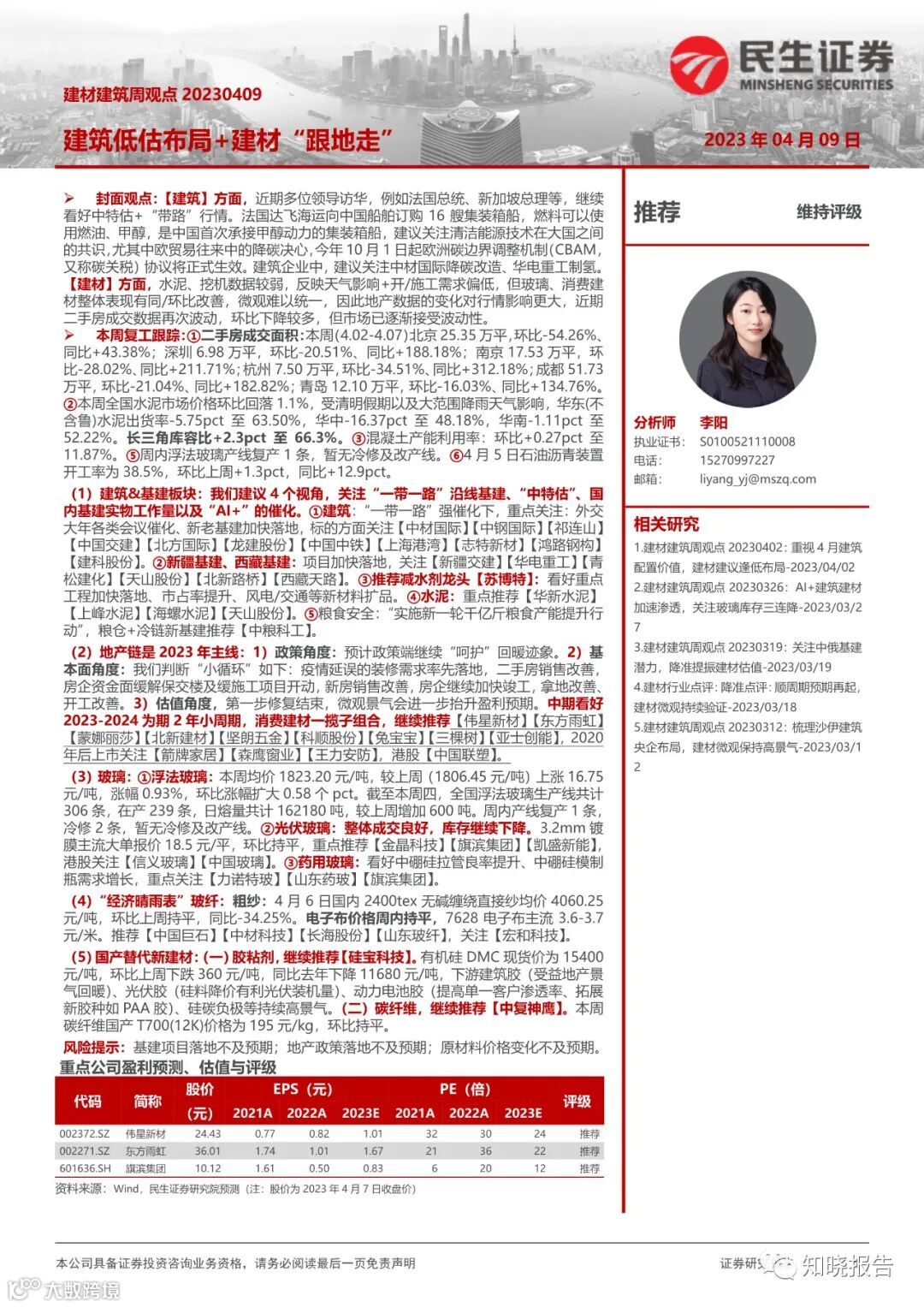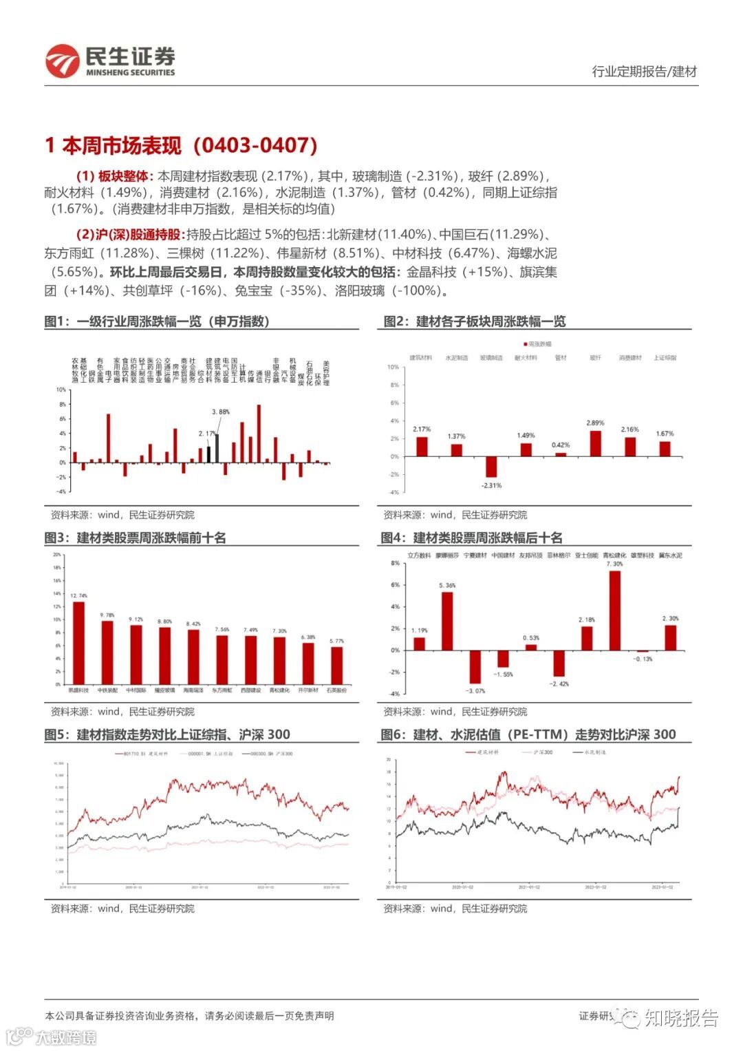 (2)沪(深)股通持股:持股占比超过 5%的包括:北新建材(11.40%)、中国巨石(11.29%)、东方雨虹(11.28%)、三棵树(11.22%)、伟星新材(8.51%)、中材科技(6.47%)、海螺水泥(5.65%)。环比上周最后交易日,本周持股数量变化较大的包括:金晶技(+15%)、旗滨集团(+14%)、共创草坪(-16%)、兔宝宝(-35%)、洛阳玻璃(-100%)。
