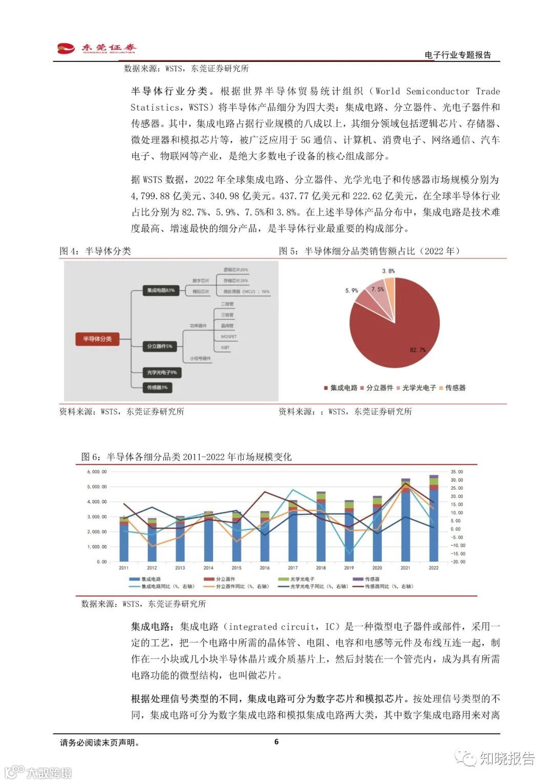 半导体产业与经济发展密切相关,下游创新驱动行业发展。半导体下游应用广泛,涵盖智能手机、PC、汽车电子和医疗等各个行业,其销售额与全球经济增长密切相关。通过对历年半导体销售额进行复盘,我们发现行业市场规模主要由终端创新决定,行业呈现在波动中成长的特点。从行业分类看,集成电路占半导体行业规模的八成以上,是半导体最重要的构成部分,也是技术难度最高、增速最快的细分品类。