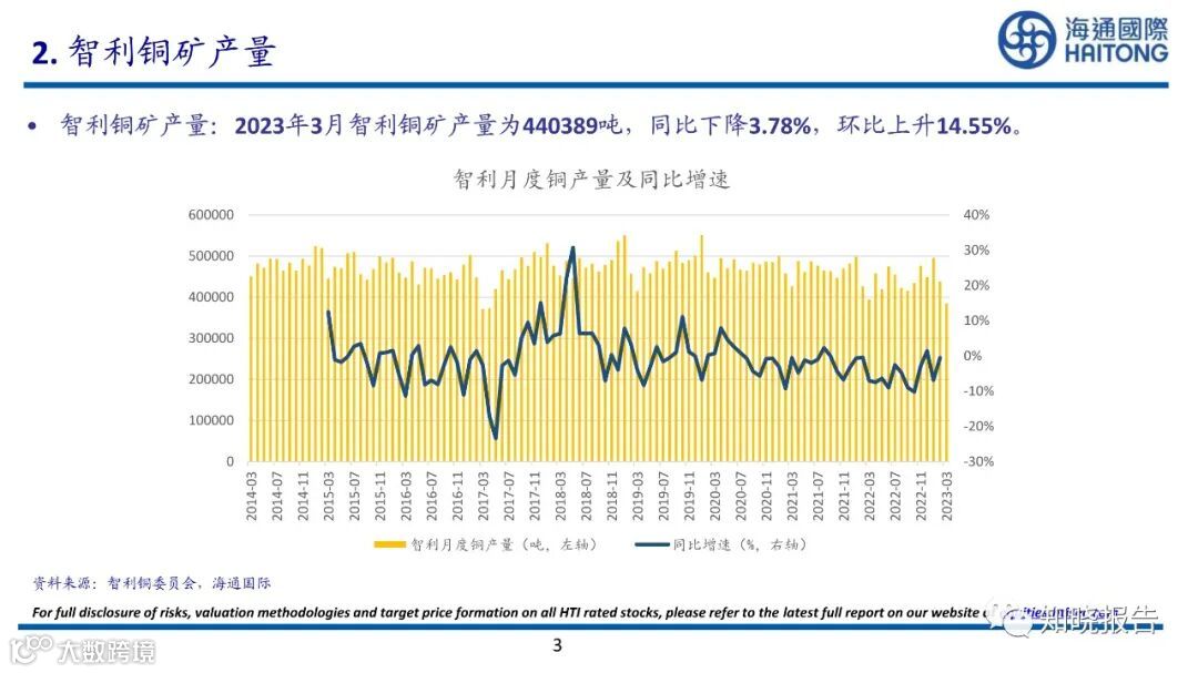 智利铜矿产量:2023年3月智利铜矿产量为440389吨,同比下降3.78%,环比上升14.55%。