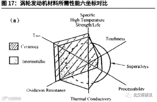 随现代新型战机对航空发动机性能要求的进一步提高,传统金属材料的应 用占比或将受到抑制,而金属基、陶瓷基以及树脂基为代表的符合材料的应用 占比可能会快速提升。参考美国 GE 公司的自适应通用发动机技术计划中,GE 航空集团在低压涡 轮和高压涡轮前缘采用了陶瓷基复合材料。在后续的自适应发动机技术发展项 目中,陶瓷基复合材料的应用进一步扩大,在高压涡轮导向叶片、排气部件上都有应用。而在树脂基复合材料的探索中,GE 于 2015 年完成全尺寸树脂基复 合材料部件的评估,主要应用于航空发动机冷端:风扇叶片、风扇机匣、风扇 帽罩等,相比于金属材料,具有较强的减重优势。相交于传统金属材料,复合材料优势明显:1)复合材料具有更高的极限工 作温度,契合新型发动机对极致工作性能的追求;2)树脂基等复合材料有较 强的减重优势,带来经济效应明显。