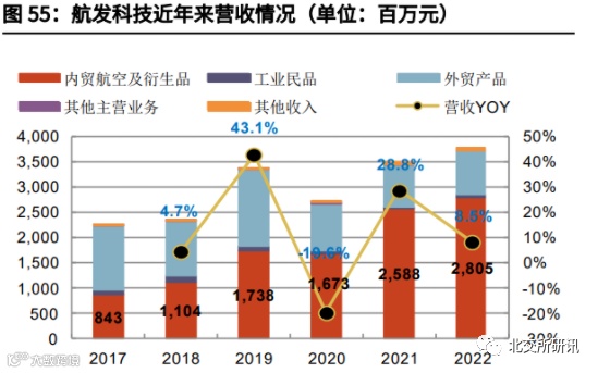 航发科技公司主要业务为航空发动机及燃气轮机零部件的研发、制造、销售、服 务,主要分为 1)内贸航空及衍生品、2)外贸转包产品、3)工业民品几个业 务板块。受近些年公共卫生问题冲击,国际航宇市场承压,给公司总体营收带 来了负面压力,而随公司科研型号取得重要进展,公司内贸业务贡献稳中有 增。2022 年公司实现营收 38.0 亿元,同比+8.5%。产品结构来看,2022 年内 贸航空及衍生品业务和外贸产品业务贡献营收占比超过 97%(其中内贸业务营 收占比 73.8%+外贸业务 23.3%),是公司主要业务。