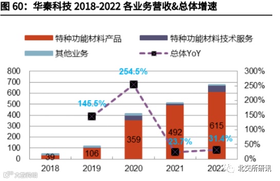 华秦科技主要从事特种功能材料,包括隐身材料、伪装材料及防护材料的 研发、生产和销售,产品主要应用于我国重大国防武器如飞机、主战坦克、舰船、导弹的隐身、重要地面军事目标的伪装和格力装备部件的表面防护。公司是目前国内极少数能够全民覆盖常温、中温和高温隐身材料设计、研 发和生产的高新技术企业,尤其在中高温隐身材料领域技术优势明显,产业化 成果突出,已形成耐温隐身涂层材料、防腐隐身涂层材料及隐身复合材料等多 系列产品,且在多军种、多型号装备实现装机应用。公司伪装材料技术先进, 解决了传统伪装材料无法实现全时段、全天候、多波段伪装的问题,并在国内 重要军事目标伪装领域得到了广泛应用。公司 2022 年实现营收 6.7 亿元,同比+31.4%。公司主要业务包括特种功 能材料产品和特种功能材料技术服务,其中 2022 年特种功能材料产品实现营 收 6.1 亿元,为公司主要营收贡献业务。