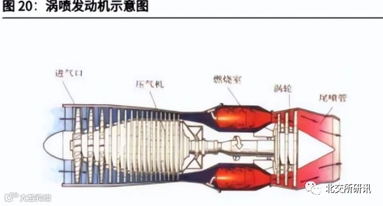 以喷气式发动机为例,航空发动机主要分为五大部件,分别是进气道、压 气机、燃烧室、涡轮和尾喷管。