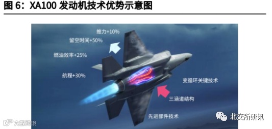 下一代先进战机发动机。2021 年 5 月 13 日,GE 航空集团宣布首台 XA100 自适应循环发动机已经完成测试,试验结果与预测的一致,并实现了美国空军自适应发动机转化(AETP)项目的关键指标。GE 航空集团还演示验证 了发动机高推力和高效率两种不同模式,以及在这两种模式之间的无缝转换, 此项核心能力将在最大程度上满足战斗机在不同飞行状态下的推力和效率需 求。通过 3 项创新:1)变循环关键技术;2)三涵道结构;3)先进部件技 术,XA100-GE-100 发动机为其配备战机提升 50%的留空时间、30%的航程、 25%燃油效率、10%的推力。XA100 代表着全新的航空发动机设计原理,相比于 F135/F136 具备代次优 势。按照双 S 形曲线创新模式,美军战斗机发动机的发展,在经历从 F100/F110 到 F119/YF120 以及 F135/F136 的第 1 条 S 曲线内的常规涡扇发动 机渐进创新发展之后,跃迁到了自适应发动机时代,从而进入了第 2 条 S 曲线 的突破性创新发展。
