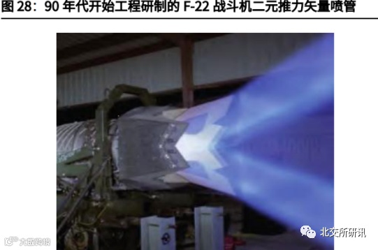 根据推力矢量的实现方式,喷口可分为机械式和流体式(多指气动式)两 类:1)机械式推力矢量喷管研究较早,技术应用较成熟,目前已经装备美国 F-22 和苏-35 等多种飞行器;2)气动推力矢量喷管利用主动控制流体技术,能 够有效弥补机械式喷管缺陷,同时在隐身、减重和机动等方面更有优势(根据 美国射流注入喷管技术项目的实验数据,利用气动方式控制喷管喉道面积,可降低 28%-40%的喷管重量;利用气动方式同时控制喷管喉道面积和出口面 积,可降低 43%-80%喷管重量;喷管采购成本和生命周期耗费可减少 37%- 53%)。