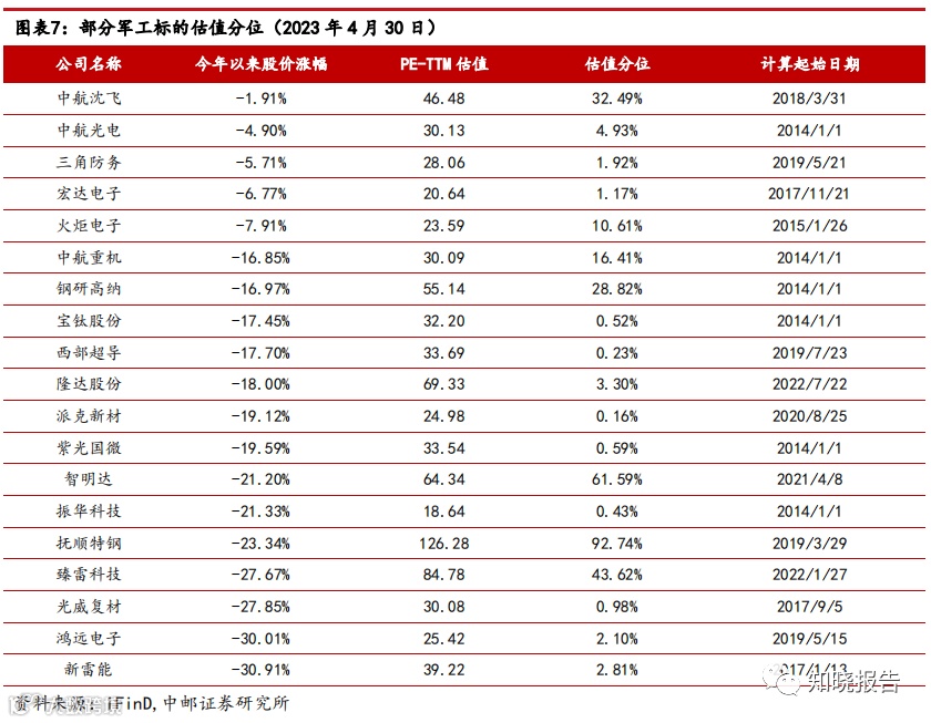 受行业增速下降以及“十四五”中期调整等不确定性因素影响,部分军工核 心标的年初以来大幅调整,经过调整后,部分标的估值吸引力凸显。2023 年年初 至今,军工指数虽然基本平稳,但不少标的跌幅超过 10%,包括新雷能、鸿远电 子、光威复材、臻镭科技、抚顺特钢、振华科技、智明达、紫光国微、派克新材、 西部超导、钢研高纳、中航重机等。其中,振华科技、鸿远电子、宏达电子、火 炬电子等上游被动元器件标的 PE-TTM 已经降至 20 倍左右;中航重机、光威复 材、三角防务、宝钛股份、派克新材、西部超导等材料类标的 PE-TTM 已经降至 30 倍左右;紫光国微、中航光电等国防信息化标的 PE-TTM 已经降至 35 倍左右;中航沈飞 PE-TTM 降至 50 倍左右,均处于历史较低水平。