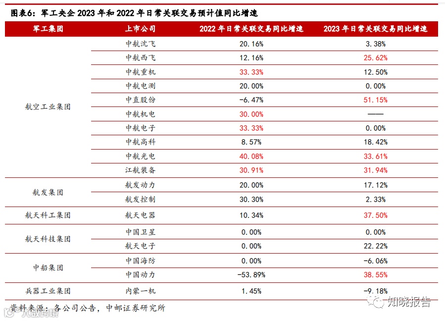 航空航天领域部分标的日常关联交易预计值保持较快增长,景气有望延续。航空方面,中航西飞、中直股份、中航光电和江航装备等 2023 年日常关联交易 预计值同比增速分别为 26%、51%、34%和 32%,保持较快增长;航天方面,航天 电器 2023 年日常关联交易预计值同比增速达 38%。此外,中国动力 2023 年日常 关联交易预计值同比增长 39%。