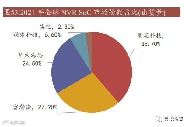 NVR SoC 是安防监控后端设备中的重要组成部分。随着 IPC SoC 的普及,与之相 配对应用的 NVR 在即插即用的可行性、远程部署以及清晰度上对比 DVR 都有很 大的优势,有望逐步实现对后者的替代。2020 年和 2021 年,受国际贸易摩擦和 新冠疫情影响,NVR SoC 销售额均出现一定程度下滑。2021 年全球 NVR SoC 市 场规模达到 0.85 亿美元。在全球安防监控市场规模持续增长及行业智能化升级的趋势下,Frost&Sullivan 预计 2021-2026 年,全球 NVR SoC 市场规模将以 7.8%的 复合增长率增长,2026 年达到 1.24 亿美元。全球 NVR SoC 市场呈现高度集中状态。在占有国际监控芯片最大份额的海思受 到美国制裁、出货量骤减后,本土芯片供应商逐渐填补空白市场。根据 Frost&Sullivan 数据,以出货量口径计算,2021 年全球市场份额排名前四的供应商 合计占据了 97.7%的市场份额,星宸科技以 38.7%的市场份额排名全球第一,富瀚 微以 27.9%排第二。目前行业中低端产品国产化程度较高,高端产品有待国内公 司未来进一步发力。