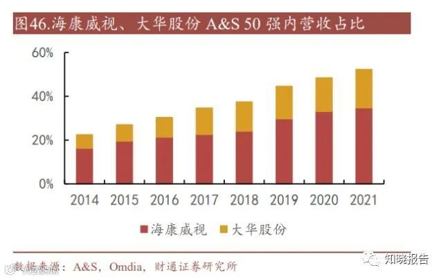 中国大陆入围榜单的企业数量逐年增多,龙头厂商地位稳固。根据 2022 年 11 月 A&S 发布的《全球安防 50 强企业》排行榜单,海康威视、大华股份蝉联榜单第 一第二的位置继续领跑;宇视科技、天地伟业分别全球第六、第七维持不变;其 他入榜中国公司还有宇通光学、中控智慧、英飞拓、科达科技、锐明技术等。纵 观历年 A&S 50 强排名变化,中国大陆入围榜单的企业数量逐年增多,体现出我 国安防行业发展的强劲态势。行业门槛逐年提高,中小企业难入局。龙头企业依托技术、资源和规模优势保持 业绩稳定增长,而中小企业在安防碎片化市场难以形成规模逐步出清,营收排名 波动剧烈。据《全球安防 50 强企业》排行榜,上榜 50 强安防企业 2021 年共实现 营业收入 290.9 亿美元,同比增长了 15.8%;50 强企业入围门槛为 1880 万美元, 同比上年提高了 435 万美元。以 A&S 营收口径计算,全球安防 CR4 由 2013 年的 32%提升至 2021 年 68%。其中,海康威视市占率约 34.71%,大华股份市占率约 17.53%,CR2 达到 52.2%,牢牢占据行业领先地位,规模及先发优势铸就高壁垒。