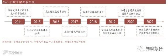 行业领先的光学解决方案提供商。公司 2011 年成立于东莞长安,2017 年上饶宇 瞳光学园投产,2019 年 9 月在深交所创业板上市,2020 年公司与蔡司开展战略合 作,共建安防摄像头联合实验室。2022 年公司取得玖洲光学控制权,进一步增强 车载领域实力。产品主要应用于公共安防监控设备、智能家居、车载摄像头、机 器视觉等高精密光学系统。2019-21年公司总营收从12.31亿元增长至20.62亿元;2019-21 年公司归母净利润从 1.03 亿元增长至 2.43 亿元。