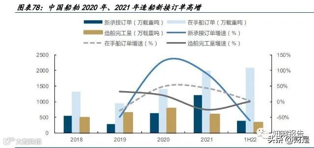 3) 公司在手订单充沛,新船订单同比高增,预计 2023-2024 年新船交付有望大幅提升。根据公司公告,2020、2021 年公司承接新船订单分别为 634、1211 万载重吨,同比 增长分别为 130%、91%。公司在手订单充裕,截至 1H22,公司在手船订单 2075 万载 重吨。船舶建造从新增到交付一般达 2-3 年左右,预计公司 2023-2024 年新船交付 量有望迎来高峰期。同时伴随部分船型新造船价格持续高位,后续有望推动公司造 船新接订单升高。