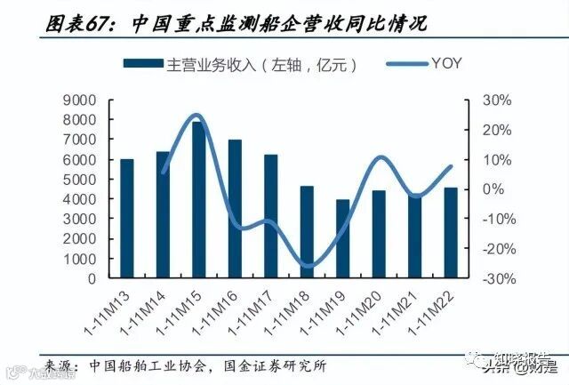 目前我国重点造船企业业绩已出现底部回升趋势。根据中国船舶工业协会数据统计, 2022 年 1-11 月,全国规模以上船舶工业企业 1093 家,实现主营业务收入 4572.9 亿元, 同比增长 8.0%。规模以上船舶工业企业实现利润总额 136.5 亿元,同比增长 70.0%,重 点监测船舶企业效益持续改善。