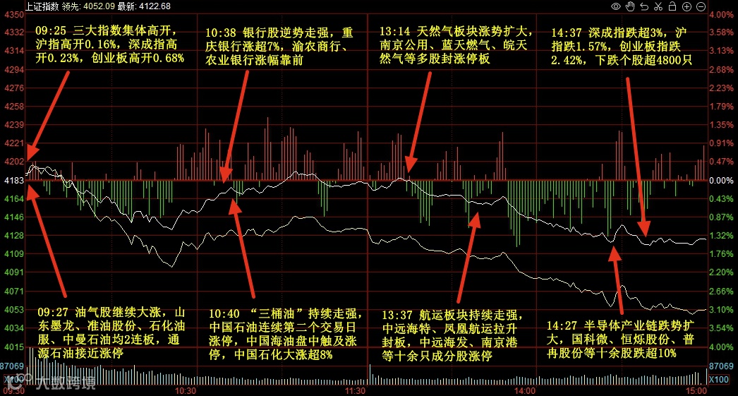 市场全天高开低走,沪指跌超1%,创业板指跌超2%,深成指跌逾3%。油气股持续大涨,中国石油、中国石化、中国海油等20余股涨停。天然气板块集体爆发,成都燃气、贵州燃气、新天然气等十余股涨停。航运板块延续强势,中远海发、中远海特、中远海能等多股涨停。下跌方面,有色、稀土板块重挫,北方稀土、包钢股份等多股触及跌停;半导体产业链走低,普冉股份、东微半导等十余股跌超10%。个股呈现普跌态势,沪深京三市超4800股飘绿,今日成交3.16万亿。