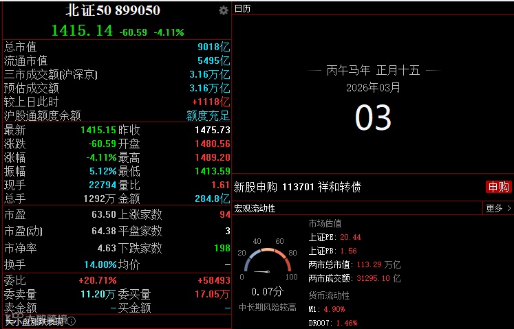 当日北交所成交额前10大个股中6只个股收涨,平均涨幅29.96%,国航远洋以成交额16.45亿元排第一。从主力资金流入看,成交额前10大个股中有6只个股呈现主力资金净流入。市场呈现 “个股普跌、少数标的逆势” 格局,仅部分低估值、业绩稳健标的抗跌,高估值成长股跌幅居前。成交量有所放大,但资金流出明显,避险情绪主导市场。